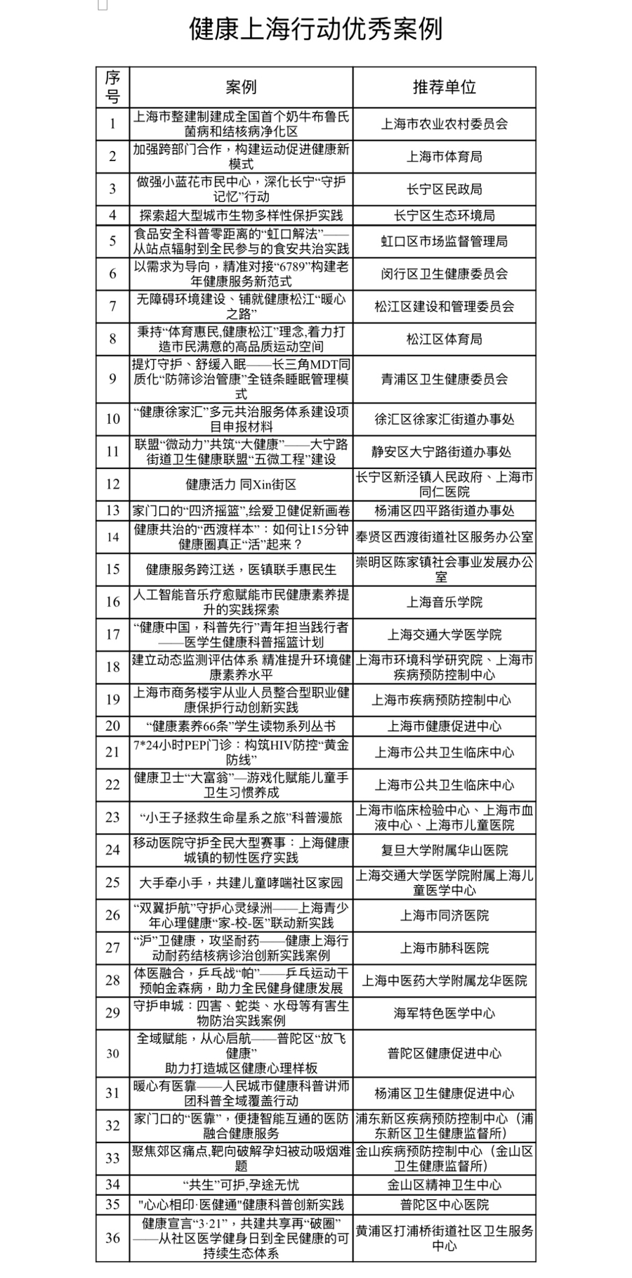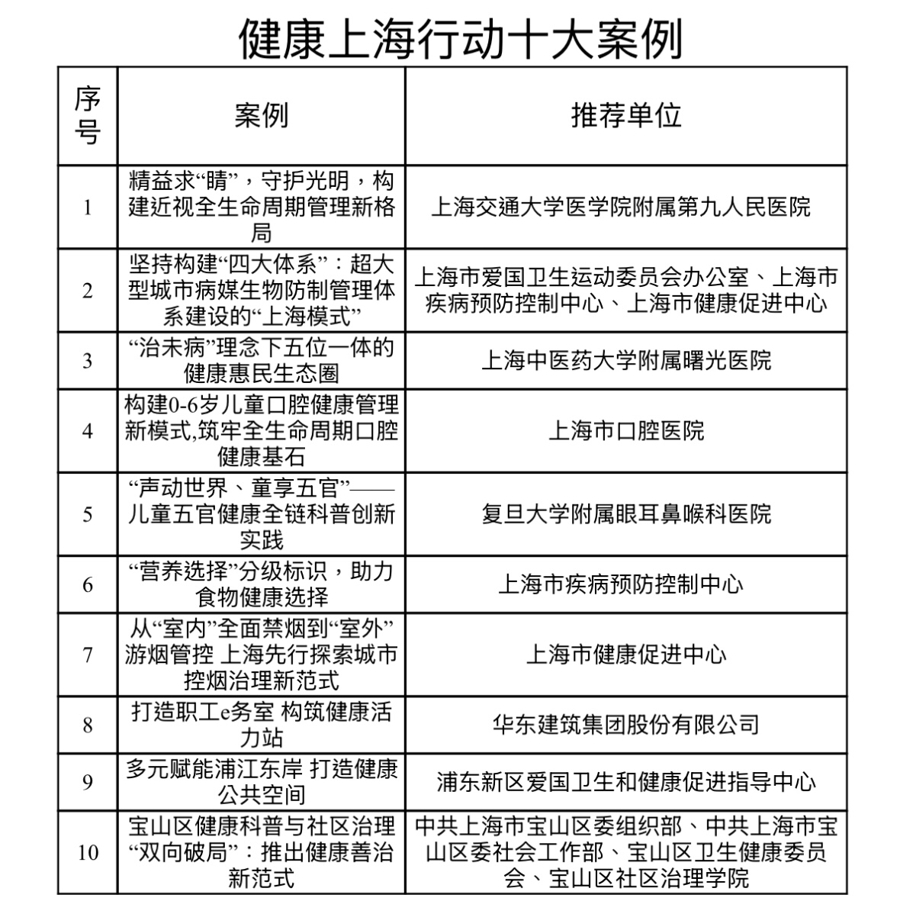 记者从市爱卫会获悉,第三轮健康上海行动优秀案例征集推选活动结果揭晓:健康上海行动十大案例与36个优秀案例正式公布,集中宣传、展示、推广健康上海行动取得的实效,进一步激励全市各行各业、社会各界积极参与健康上海建设,形成健康上海行动的强大合力,深入贯彻落实“健康优先发展战略”,推进健康中国建设。